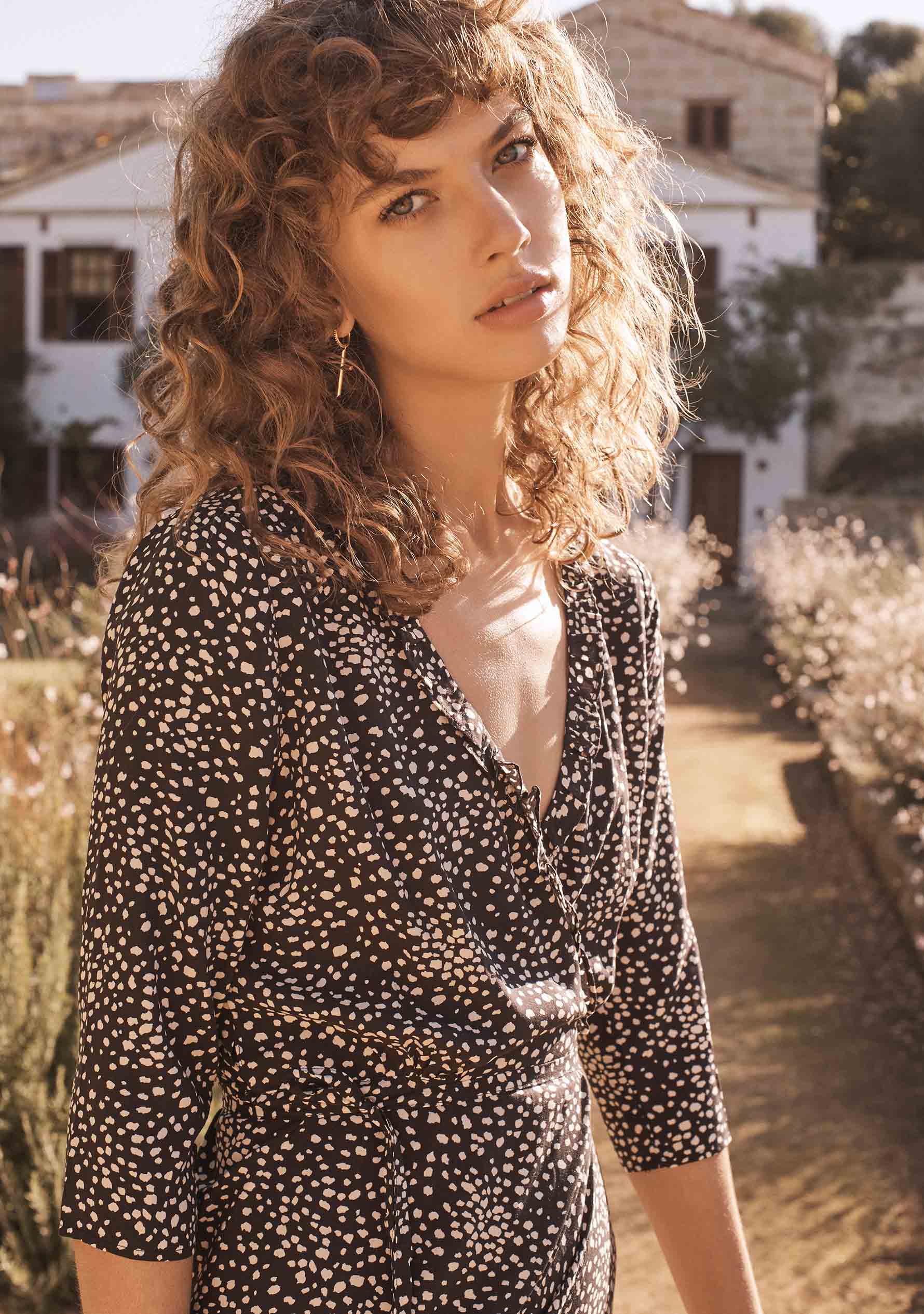 Made for all kinds of magic. the Valentina Fiesta Mini Dress is effortless with a feminine edge. Stitched together with a fitted waist. buttoned front. and frilled hem and sleeves. its patterned rayon fabric features threads of gold lurex for a subtle sparkle.
