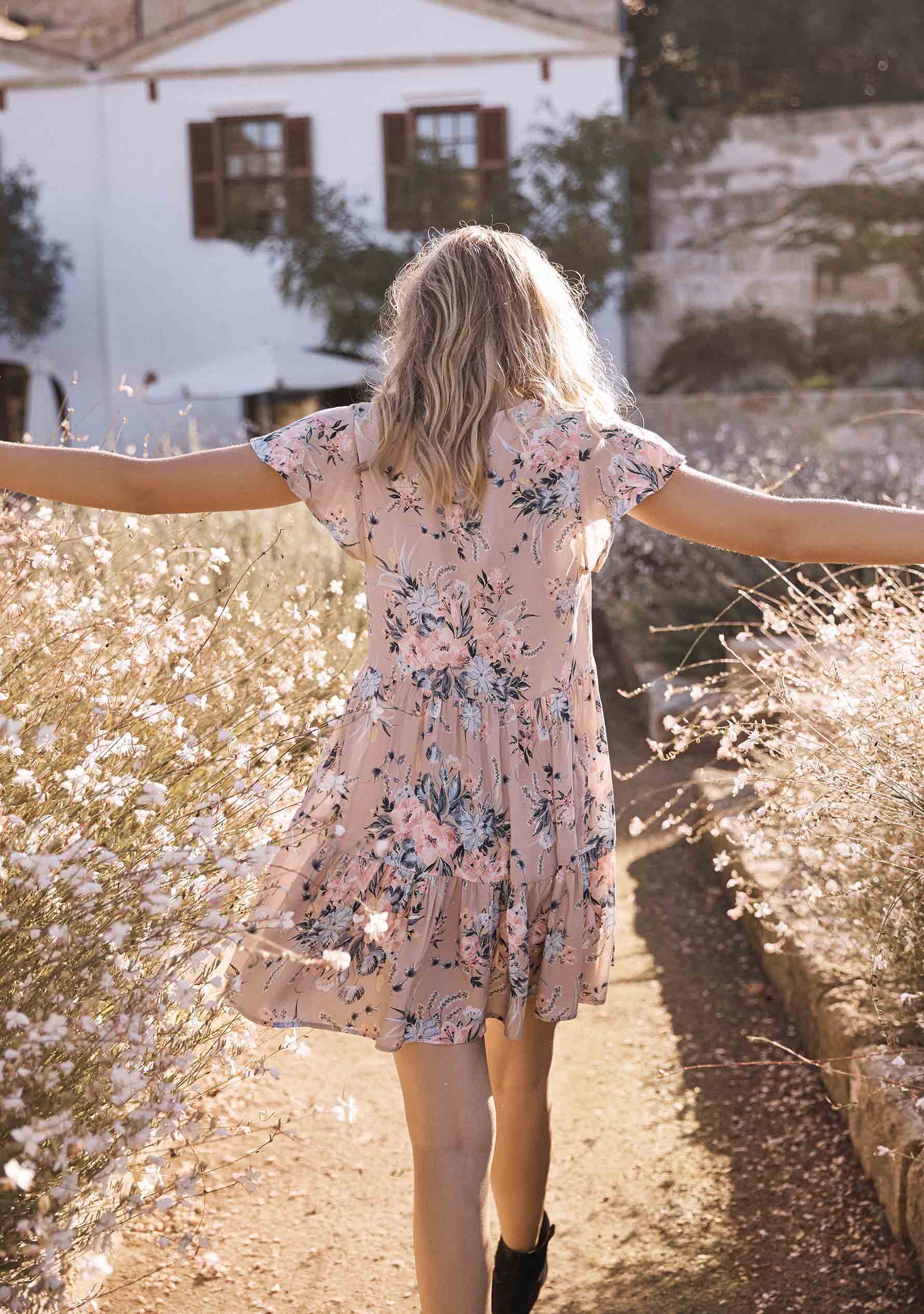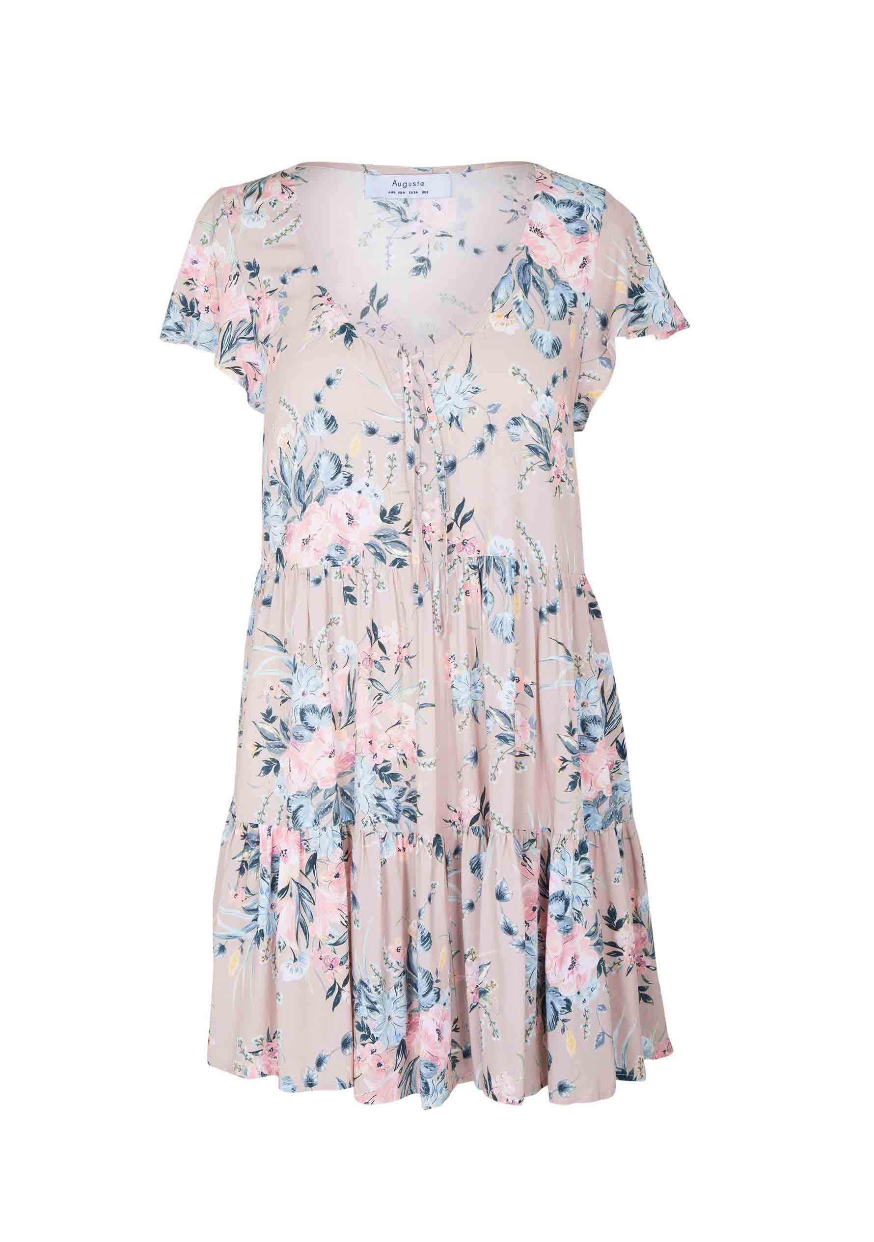 Made with a sense of ease that never gets old. The pull-on-and-go Scarlett Babydoll Mini Dress is crafted in the softest rayon with a vintage-inspired floral print. frilled sleeves. tiered skirt and button-down front with a tie.