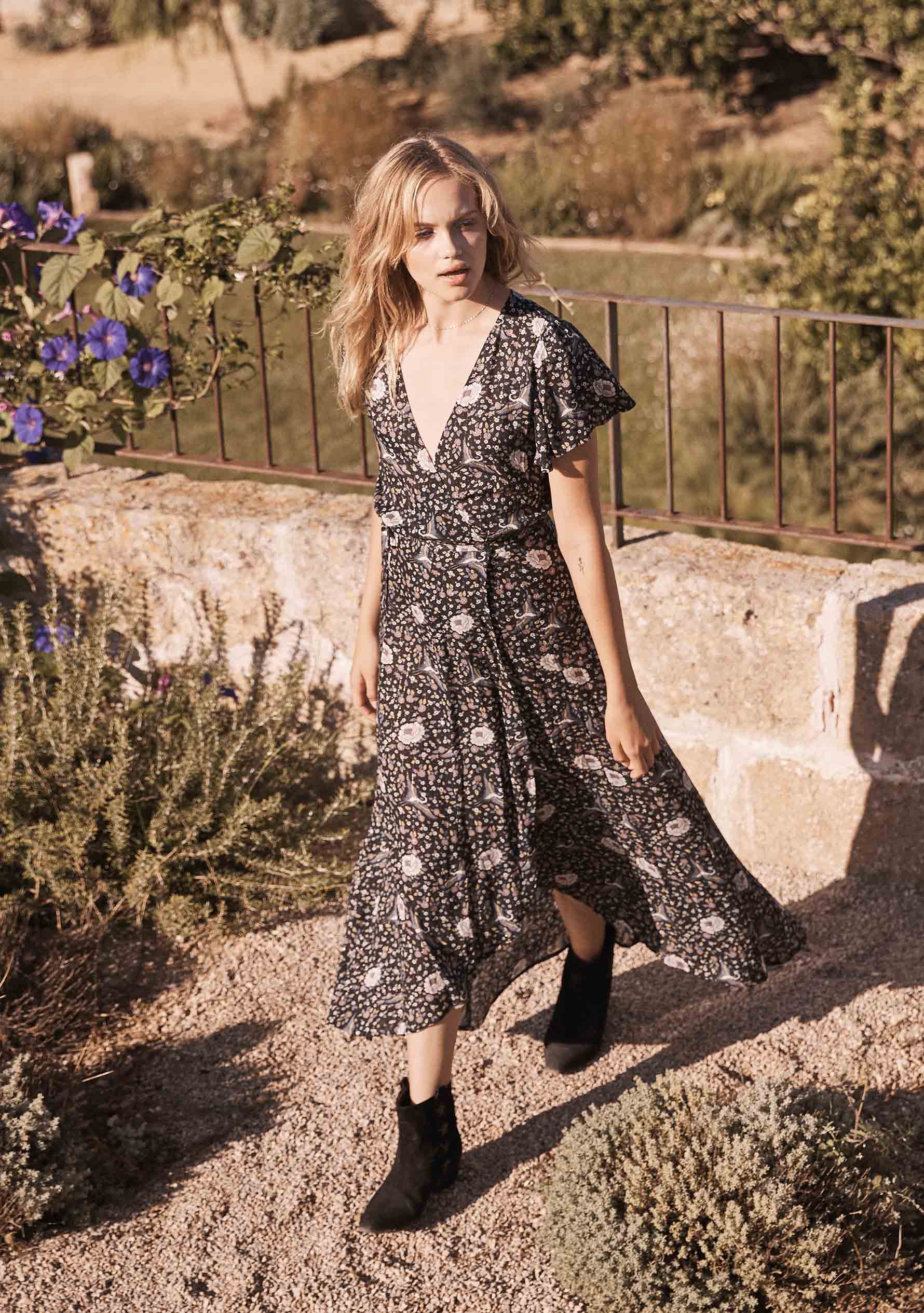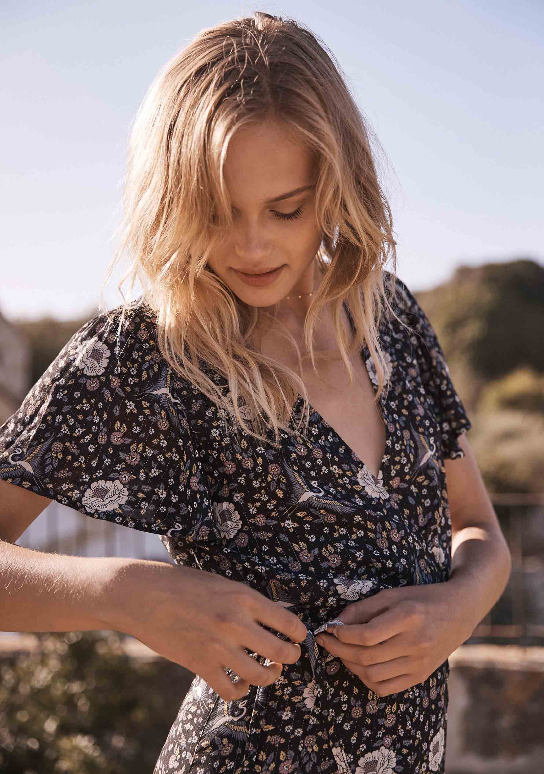 In an Auguste online exclusive black colour way. stitched together with floaty sleeves and an adjustable tie waist. its patterned rayon fabric features threads of gold lurex which give it a subtle sparkle.